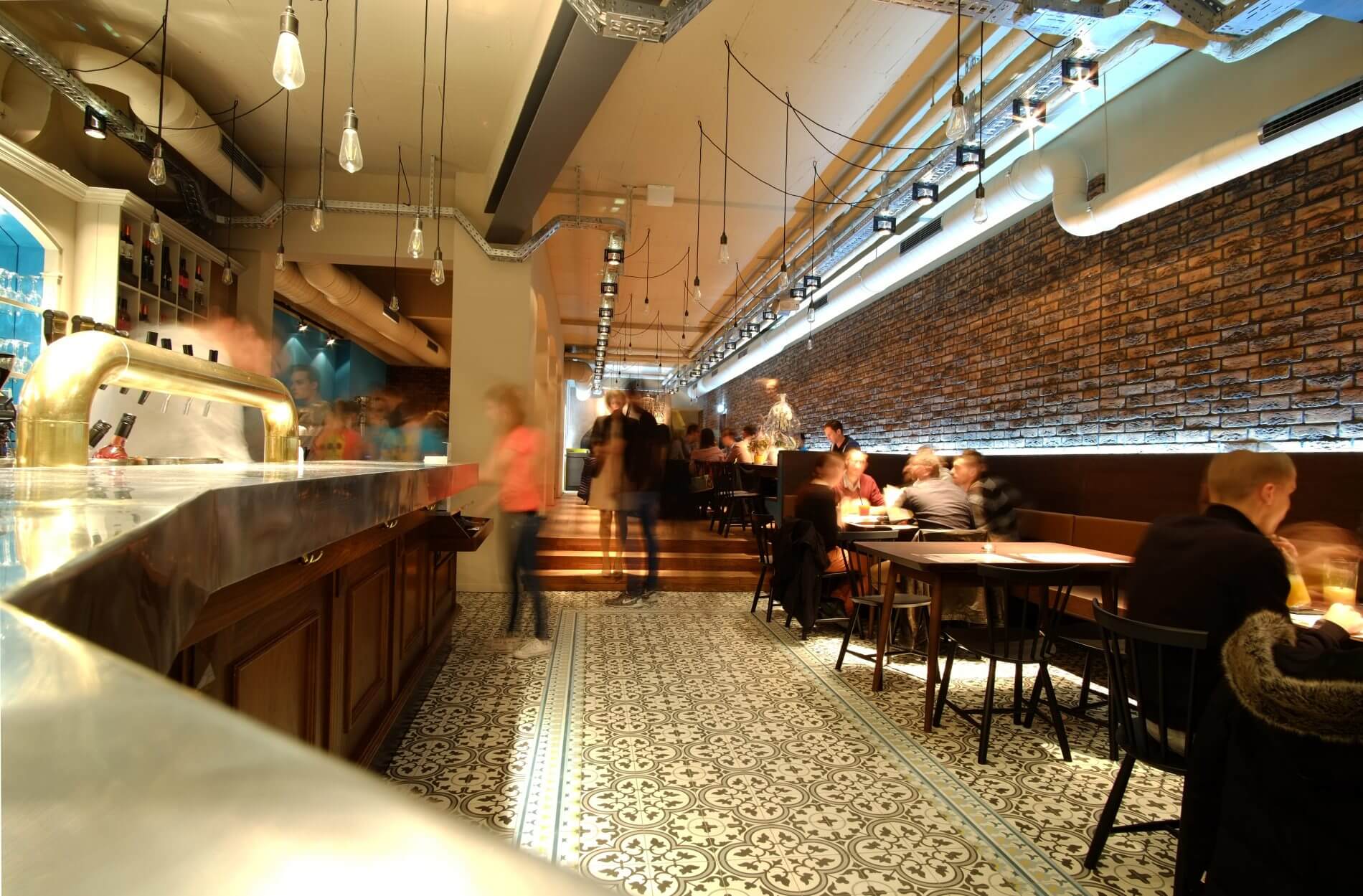 Dabei war das Ziel der Restaurantplanung ein Redesign. Die historische Raumstruktur sollte wieder erlebbar werden und damit an die große Tradition der Heidelberger Gastronomie anzuknüpfen. Ganz bewusst wurden alle historischen Elemente des alten Lokals beibehalten und mit gründerzeitlichen Originalmaterialien ergänzt, die ein Gastraum schon seit Jahrhunderten kennt: Eichenbänke, Parkett. Selbst die Theke besteht nicht aus modernem Edelstahl, sondern – wie in alten Zeiten – aus Zink.